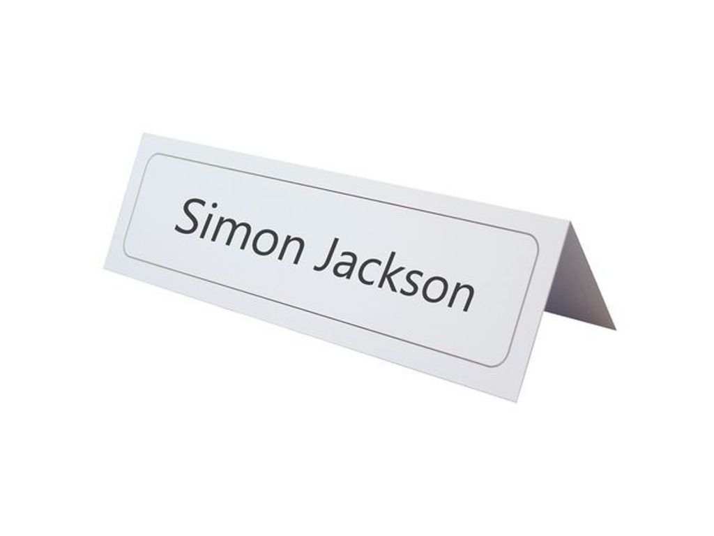 Beskrivning av Bordsskylt DURABLE 61x210mm vit 100/fp Stark kvalitet för konferenser etc. Lätt att vika Namnplattan är inramad