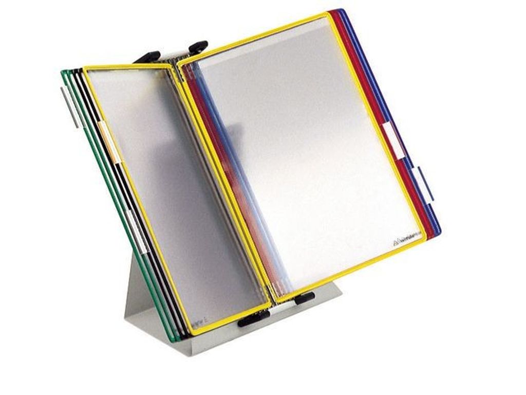 Perfekt lösning för exempelvis butiker, lager och industrier. Det här stället av robust metall sparar plats och skyddar dina dokument på ett utmärkt sätt. Välj själv om du vill ha det stående på bordet eller fästa det på väggen. - 10 fickor i sorterade färger medföljer - Enkel att montera och att använda