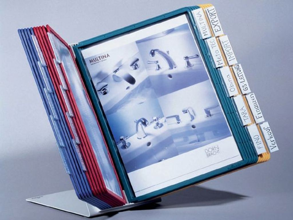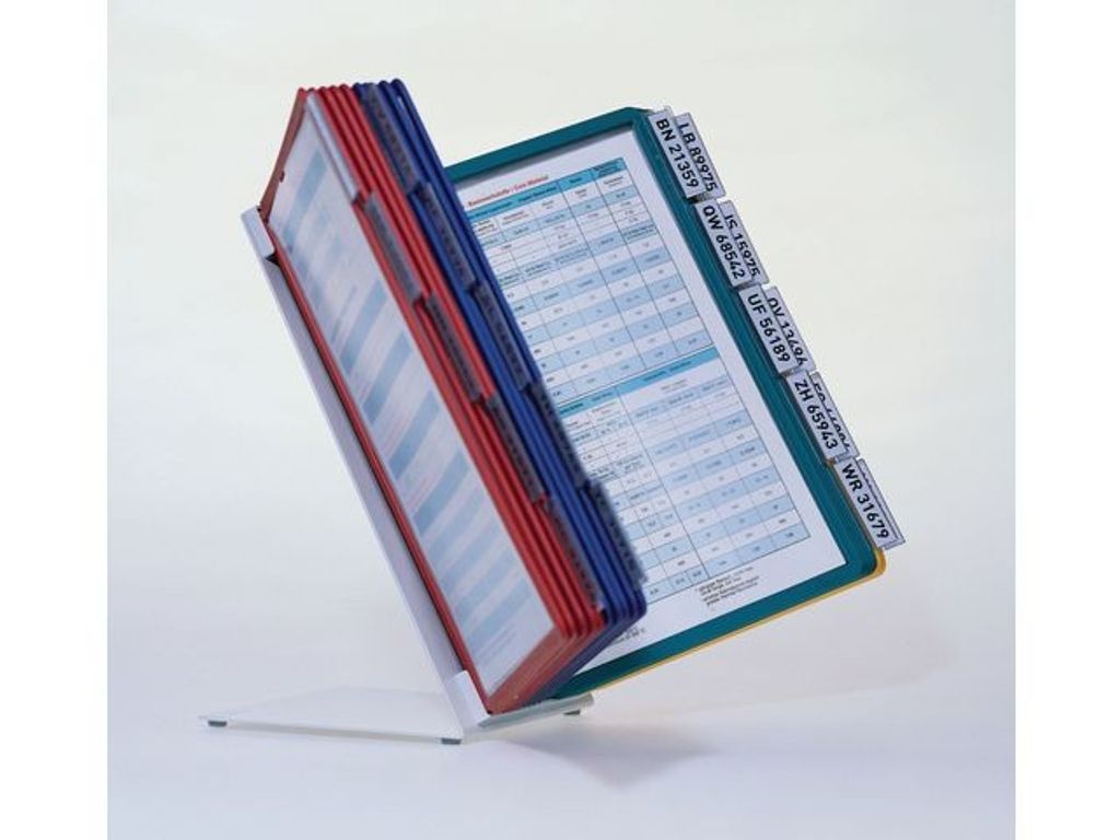 Placera detta skyltningssystem på skrivbord och bordsskivor för handsfreeläsning. Varje panel är lätt att vända upp till 90 grader och visar information på båda sidorna. Infoga enkelt dokument i de genomskinliga panelerna i denna demobok. Panelerna är tillverkade av polypropylen (PP) och basenheten är tillverkad av metall för hållbarhet. Den här HÅLLBARA bordsskyltningen är utrymmesbesparande och mångsidig, och kan bland annat hålla produktinformation, prislistor, presentationer och mycket mer. - Skyltningssystem - Levereras med 20 A4-paneler - Sparar skrivbordsutrymme - Utformad för handsfreeläsning - Mångsidig användning hemma och på kontoret - Stående eller liggande visning - Olika färger: gul, röd, grön, mörkblå - Rubrikhållare och instick ingår