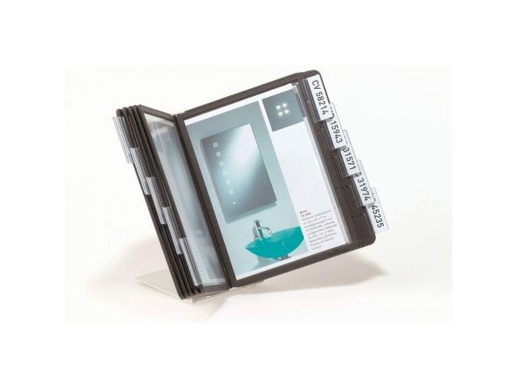 Samla information och organisera den med det här visningssystemet från Durable Vario, som har 10 medföljande paneler och ett metallstativ. Det här visningssystemet från Durable Vario ger enkel åtkomst till information i skolor, kontor eller industriella konfigurationer. Den kraftiga metallställningen ger flexibel placering på skrivbord, arbetsbord eller informationsdiskar, medan A5-dokumentramarna av polypropen (PP) kan skannas utan att sidan tas bort. Med 10 flikar för effektiv organisation och 10 svarta ramar är det här visningssystemet från Durable Vario ett effektivt sätt att sprida viktig information eller anvisningar. - Presentera skyddad och organiserad information - Antireflekterande ramar för skanning - Kraftigt metallbordsstativ - Färg: Svart - Mått: A5 - En förpackning innehåller 10 visningspaneler