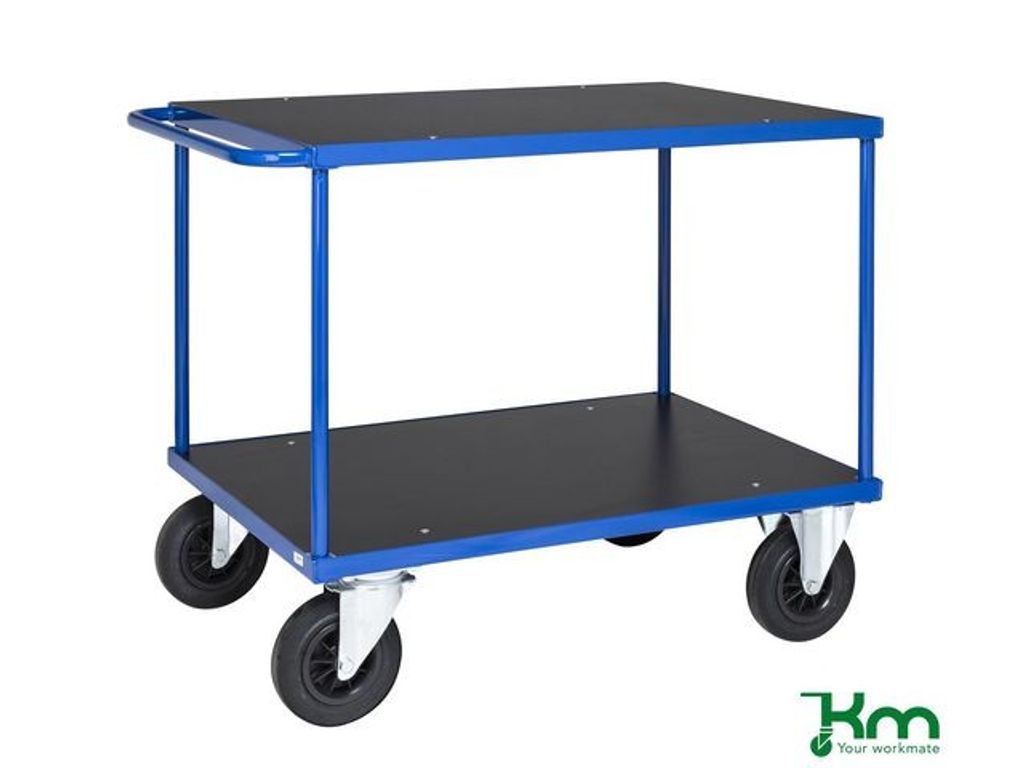 Praktisk bordsvagn med handtag på ena sidan. Pulverlackerad bordsvagn med många användningsområden. Med rejäla och stadiga hjul. Laminatskivor till hyllplan. - Belastning: 500kg - Storlek: 1100x600x890mm (LxBxH) - Färg: Blå/MDF, svart - Vagnens vikt: 27,5kg - Bromsade hjul: Nej - Hjultyp: 2 fasta, 2 länk