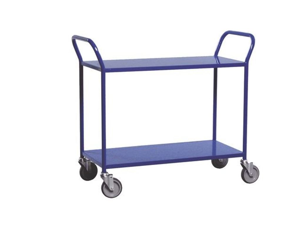 Lackerad bordsvagn i stålrörskonstruktion. Höjd övre hyllplan 760 mm, avstånd mellan hyllplan 530 mm. 4 länkhjul 125 mm, med grå gummibana. - Belastning: 250kg - Storlek: 1080 x 480 x 940mm (LxBxH) - Storlek hyllplan: 440 x 900mm - Höjd övre hyllplan: 760mm - Avstånd mellan hyllplan: 530mm - Hjultyp: 4 länkhjul, 125mm - Bromsade hjul: Nej - Vagnens vikt 23kg - Färg: Blå