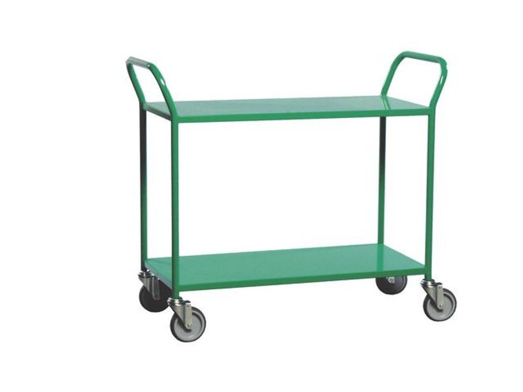Lackerad bordsvagn i stålrörskonstruktion. Hyllplanen kan monteras med kant upp eller ner efter eget önskemål. Med rejäla hjul vilket gör den lätt att köra. Levereras omonterad i platt paket. - Belastning: 250kg - Storlek: 1080 x 480 x 940mm (LxBxH) - Storlek hyllplan: 440 x 900mm - Höjd övre hyllplan: 760mm - Avstånd mellan hyllplan: 530mm - Hjultyp: 4 länkhjul, 125mm - Bromsade hjul: Nej - Vagnens vikt 23kg - Färg: Grön