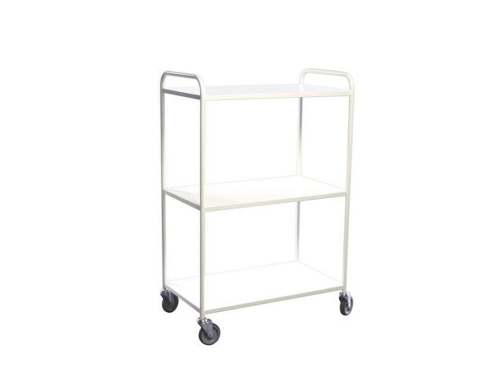 Lackerad bordsvagn i stålrörskonstruktion. Vid montering kan du välja om du vill ha hyllplanet med eller utan hyllkant. Med rejäla hjul vilket gör den lätt att köra. Levereras omonterad i platt paket. - Belastning: 250kg - Storlek: 980 x 585 x 1445mm (LxBxH) - Storlek hyllpla: 900 x 540mm - Höjd till översta hyllplan: 1340mm - Avstånd mellan hyllplan: 530mm - Hjultyp: 4 länkhjul, 125mm - Bromsade hjul: Nej - Vagnens vikt: 39kg