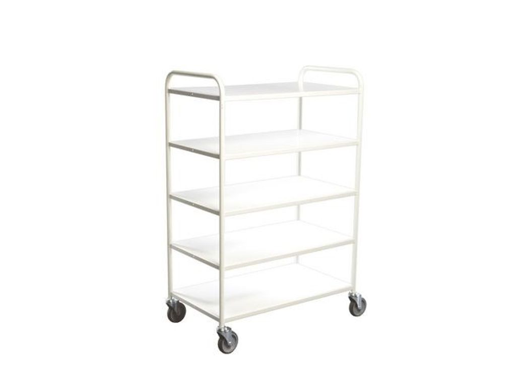 Hög plåtvagn i 5 plan. Hyllplanen kan monteras med kant upp eller ner efter eget önskemål. Rejäla 125mm hjul vilket gör den lätt att köra. Levereras omonterad i ett platt paket. - Belastning: 250kg - Storlek: 980 x 585 x 1445mm (LxBxH) - Storlek hyllplan: 900 x 540mm - Höjd till översra hyllplan: 1340mm - Avstånd mellan hyllplan: 250mm - Hjultyp: 4 länkhjul, 125mm - Vagnens vikt: 39kg