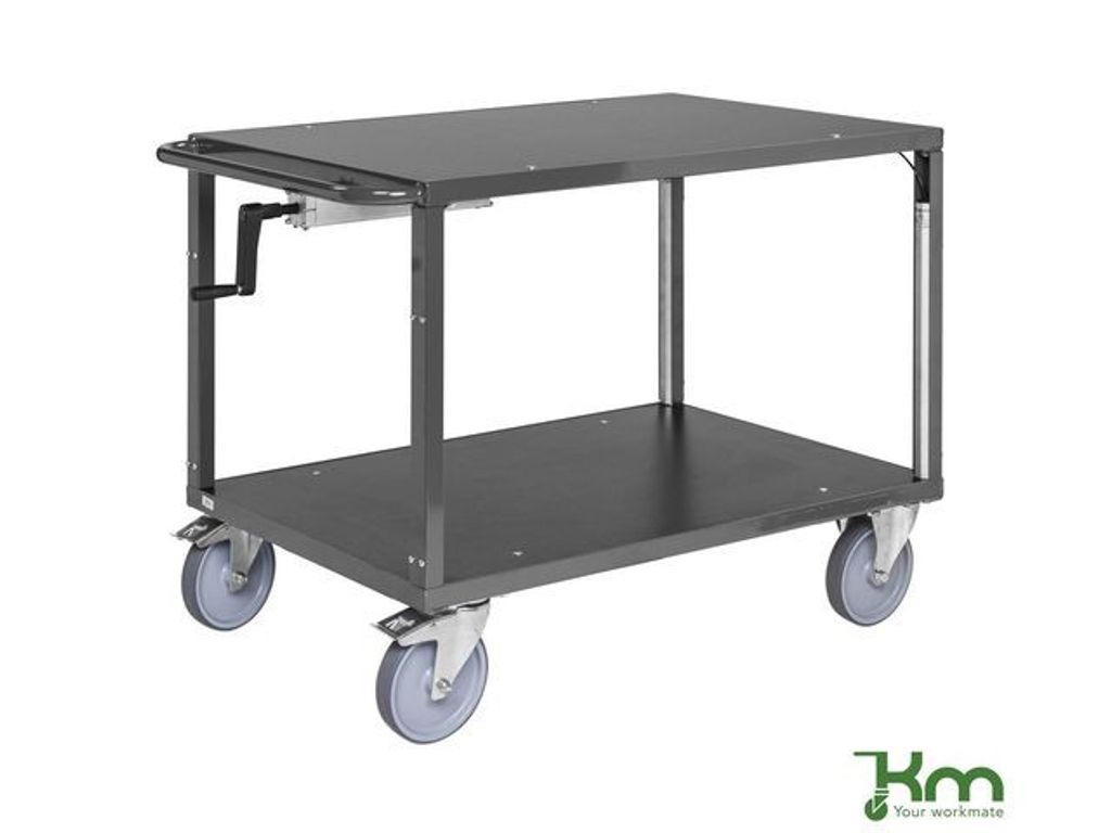 Bordsvagn där övre hyllplanet kan höjas och sänkas med hjälp av en vev. Höjden kan enkelt justeras mellan 845-1100mm. - Belastning: 400kg - Storlek: 1000 x 700 x 845mm (LxBxH) - Färg: Mörkgrå - Vagnens vikt: 31kg - Bromsade hjul: Ja - Hjultyp: 2 fasta, 2 länkhjul med broms
