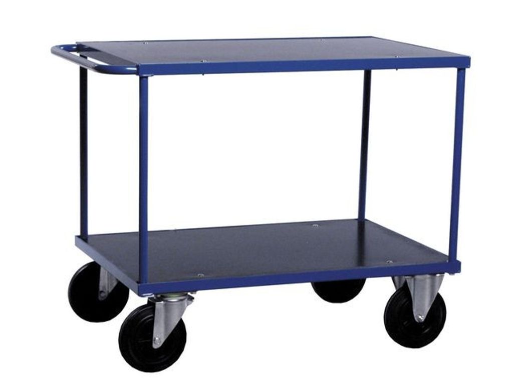 Praktiskt och lättmanövrerad vagn tillverkad i blålackerat stål och MDF direktlaminat, vilket ger en slitstark yta. Levereras omonterad i ett platt paket. - Belastning: 500kg - Storlek: 1100 x 700 x 870mm (LxBxH) - Avstånd mellan hyllplan: 580mm - Mellanrör: 25mm stålrör - Hjultyp: 2 fasta, 2 länk massiva gummihjul, 200 x 50mm - Bromsade hjul: Nej - Vagnens vikt: 39kg