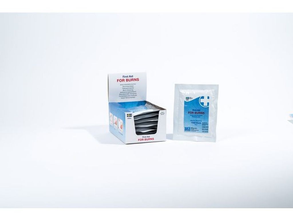 Brännskadekompress i storleken 10x10 cm med gel, 50g. De gelindränkta kompresserna hålls kvar på skadan även vid rörelse vilket gör att de fungerar bra vid transport för fortsatt vård (jfm vatten!). Gelen bromsar effekterna av en brännskada genom att snabbt svalka skadestället och transportera bort värmen. Med användning av brännskadekompress minskar risken för blåsbildning väsentligt. - Storlek: 10x10 cm - Antal: 10st - Tillverkade i Sverige