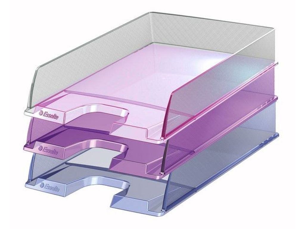 Glasklar Europost-brevkorg - Esselte såklart Design i starka färger och tilltalande VIVIDA-mönster på basen. Perfekt komplement till skrivbordet och VIVIDA-produkter. Kompletterar andra Europost och VIVIDA-produkter för det perfekta utseendet på kontoret Unikt mönster på sidorna som lyser upp arbetsplatsen Stapelbar vertikal eller stegvis i 3 lägen för bättre organisation Rundad frontöppning för enkel återkomst av handlingar Utrymme för etikett placerad till vänster eller höger, för enkel uppmärkning av innehåll - Material: Polystyren (PS) - Innermått: (BxHxD) 243x57x332mm - A4