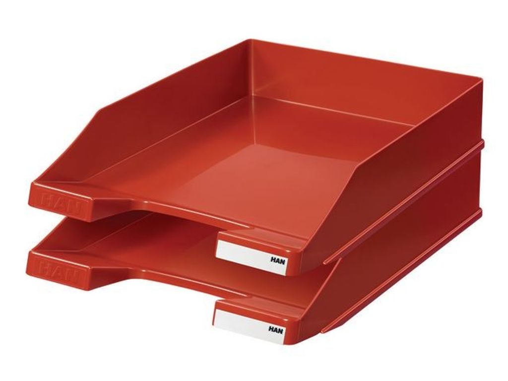 KLASSIK brevkorg ifrån HAN i modern design. Staplingsbar och kompatibel med andra brevkorgar i standardmått. Med ett stort urtag för snabb och enkel tillgång till dokument samt en liten vinklad frontdel som hindrar dokument från att glida ut. - För pappersformat: A4 / C4 - Yttermått (B x D x H): 255 x 348 x 65 mm - Material: högkvalitativ plast, polystyren (PS) - Färg: Röd (högglans)