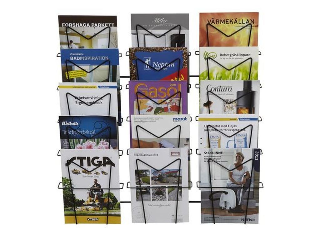 Det här broschyrstället av tråd gör det enkelt att organisera tidskrifter, tidningar och broschyrer i bokhandlar, kontor eller utbildningscenter. Med det här broschyrstället av tråd med 15 fack är det enkelt att organisera läsmaterial. Det här stället är lämpligt tillbehör för exponering av läsmaterial och sparar golvyta, eftersom det är väggmonterbart. Det fungerar som ett minimalt, krångelfritt ställ och piffar upp tomma väggytor. Dessutom är det gjort av svart överdragen tråd som ger stadigt stöd och har en enkel design. - 'Lämpligt för att stapla läsmaterial - Monterbart, tåligt och robust - Har en enkel design - Antal fack: 15 - Material: Tråd - Fackens djup: 40 mm - Format: A4 - Färg: Svart - Mått: 740 x 800 x 140 mm' -