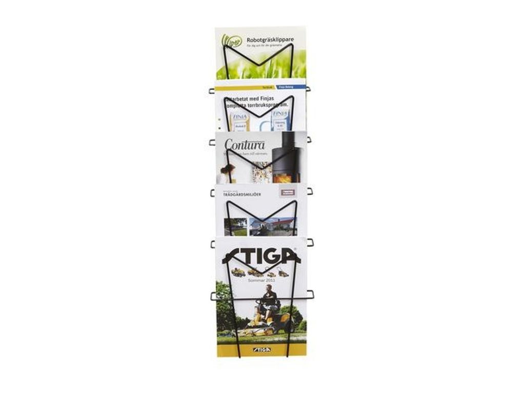 Det här broschyrstället av tråd gör det enkelt att organisera tidskrifter, tidningar och broschyrer i bokhandlar, kontor eller utbildningscenter. Med det här broschyrstället av tråd som har 5 fack är det enkelt att organisera läsmaterial. Det här stället är lämpligt tillbehör för exponering av läsmaterial och sparar golvyta, eftersom det är väggmonterbart. Det fungerar som ett minimalt, krångelfritt ställ och piffar upp tomma väggytor. Dessutom är det gjort av svart överdragen tråd som ger ett stadigt stöd med en enkel design.' - 'Lämpligt för att stapla läsmaterial - Monterbart, tåligt och robust - Har en enkel design - Antal fack: 5 - Material: Tråd - Fackens djup: 40 mm - Format: A4 - Färg: Svart - Mått: 740 x 240 x 140 mm' -
