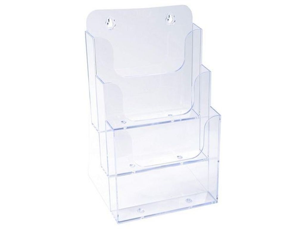 Visa era broschyrer och nyhetsblad - både snyggt och smart! Kan stå på bord eller hängas upp på vägg. Ett broschyrställ med tre fack för A5. Stället är tillverkat av klar polystyren. Varje fack har ett djup på 28 mm. Levereras färdigmonterat. Helgjuten produkt – ingen montering krävs. - Längd: 18,1 cm - Höjd: 15,4 cm - Bredd: 28 cm