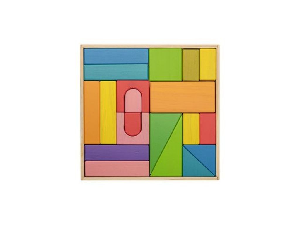 Barnen kommer att älska att skapa spännande strukturer med dessa robusta byggklossar i trä. Blocken levereras i fina färger (rosa, grön, blå, gul, orange med mera) och täcker en mängd olika former som rutor, bågar och stavar m.m. Främjar igenkänning av färg och form, utvecklar finmotorik och hand-ögonkoordination. Detta generöst tilltagna set har tillräckligt för att alla ska vara med och främja sociala färdigheter, delning och kommunikation. - Varje set innehåller 20 delar och en träbricka som är idealisk för förvaring - Cirka 21x21x5 cm - Material: Furu, plywood - FSC-certifierat trä