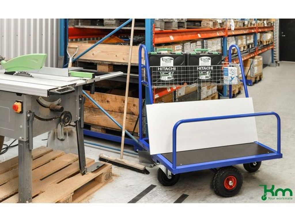 Beskrivning av Byggvaruvagn Praktisk pulverlackerad byggvaruvagn. För smidig lastning av byggvaror. - Belastning: 500kg - Storlek: 1000 x 700 x 1250mm (LxBxH) - Färg: Blå - Vagnens vikt: 35,5kg - Bromsade hjul: Nej - Hjultyp: 2st fasta, 2 länk 260mm