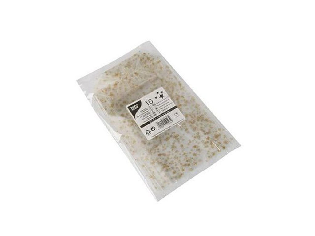 Perfekt att ha som presentpåse! Påsar tillverkade av transparent polypropylen med dekorativa guldstjärnor. - Mått: 23,5 x 14,5 x 6 cm - Bottenyta: ca. 6 x 9 cm - Materialtjocklek: 30 my - Med tryckta guldstjärnor