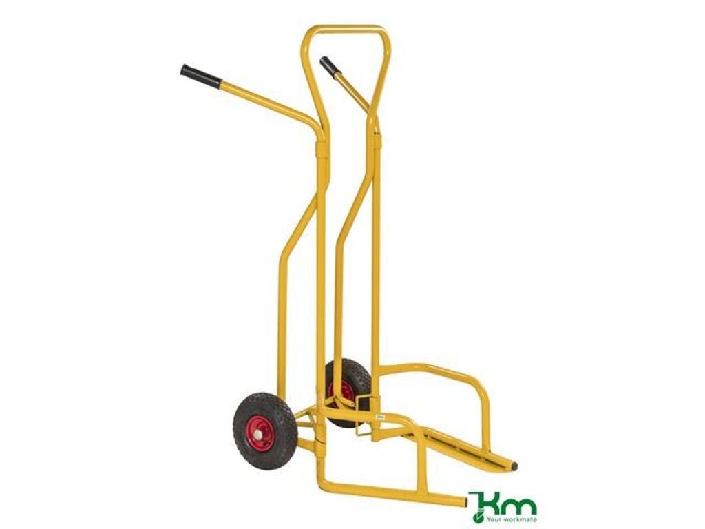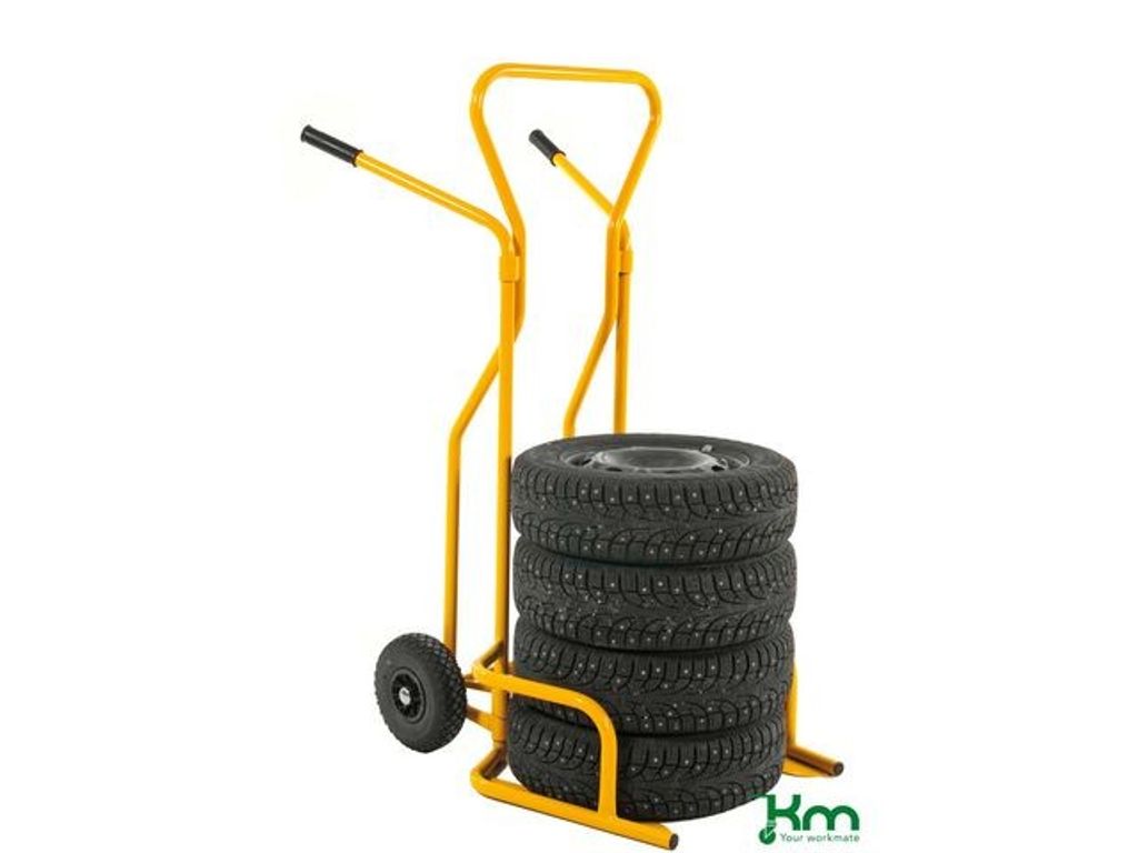 Pulverlackerad, kraftig däckkärra som underlättar transporten av däck. Med rejäla däck som gör det lätt att köra på alla underlag. - Belastning 200kg - Storlek: 1300 x 840 x 1490mm - Öppet läge: 800mm - Stängt läge: 400mm - Färg: Gul - Vikt: 24,5kg - Bromsade hjul: Nej - Hjul: 2 fasta luftgummihjul, 260 x 85mm