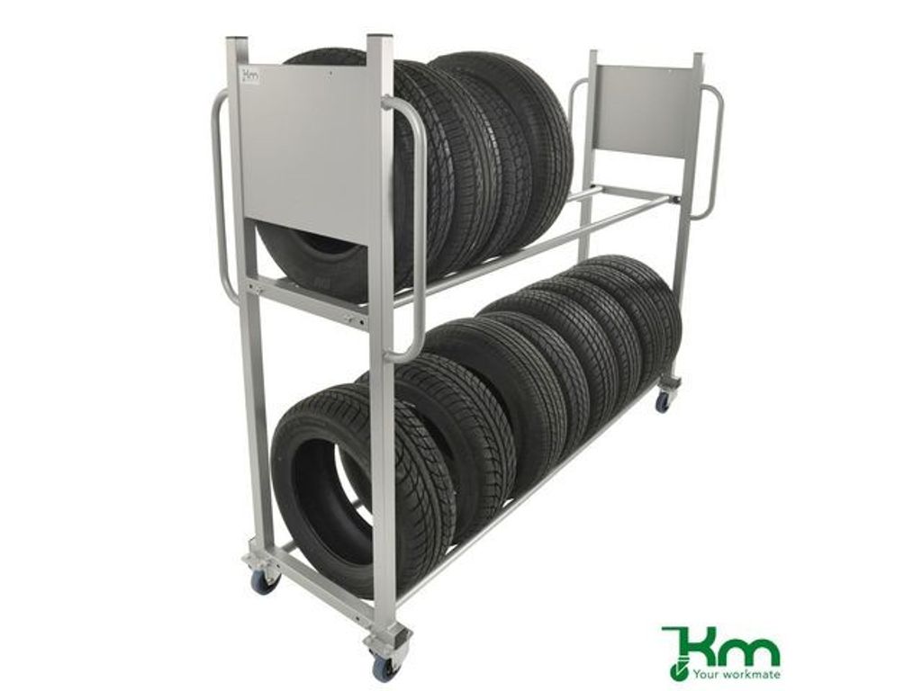 Pulverlackerad förvaringsvagn för däck, det självklara valet vid däckhantering. Med kraftiga hjul och rejäla handtag som gör den mycket lättmanövrerad. Justeringsmöjligheter som gör att den passar alla typer av däck till personbilar. Levereras omonterad. - Belastning 300kg, 150kg/plan - Storlek: 2030 x 720 x 1620mm - Höjd till 1:a plan: 168mm - Höjd till 2:a plan: 1010mm - Avstånd mellan planen: 810mm - Planen är i bredd justerbara i tre olika positioner: 288mm, 328mm, 368mm - Färg: Grå - Vikt: 47kg - Bromsade hjul: Nej - Hjul: 2 fasta, 2 länkhjul 100 mm, blå elastik
