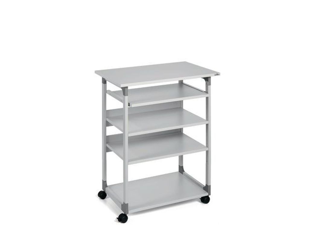 Datorbord på hjul som är praktiskt och användbart på kontor, i konferensrum eller för mobila arbetsplatser. Slitstarka hyllplan där tangetbordshyllan är utdragbar och höjdmässigt justerbar i 30 mm intervaller upp till 1090 mm för en bekväm arbetsställning. Bildkärmshyllan kan justeras mellan 960-1240 mm i 20 mm intervaller. Metallstomme med reptålig polyesterbeläggning och fiberglasförstärkta plasthörnor. 4 st svängbara länkhjul, varav 2 st har broms. Lätt att förflytta och stabil när den är 'parkerad'. - Levereras i platt paket med monteringsanvisningar - Maxbelastning 30 kg - Mått översta hyllan: 750 x 534 mm (B x D) - Mått tangentbordshyllan: 586 x 420 mm (B x D) - Mått bottenhylla: 610 x 464 mm (B x D) - Mått mittenhyllor: 610 x 434 mm (BxD) - Totala mått: 950-1150 x 750 x 564 mm (H x B x D).