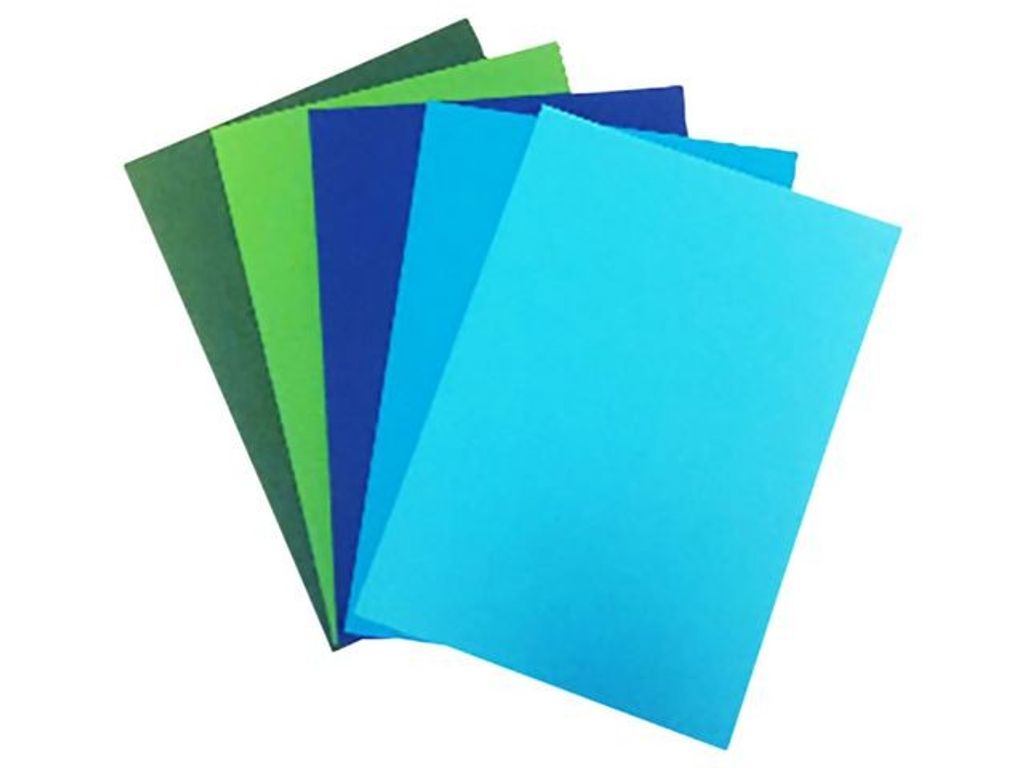 Dekorationskartong i 5 olika nyansfärger. 10 ark/färg. 225g och A2. 50 ark/fp. Blå - grön.