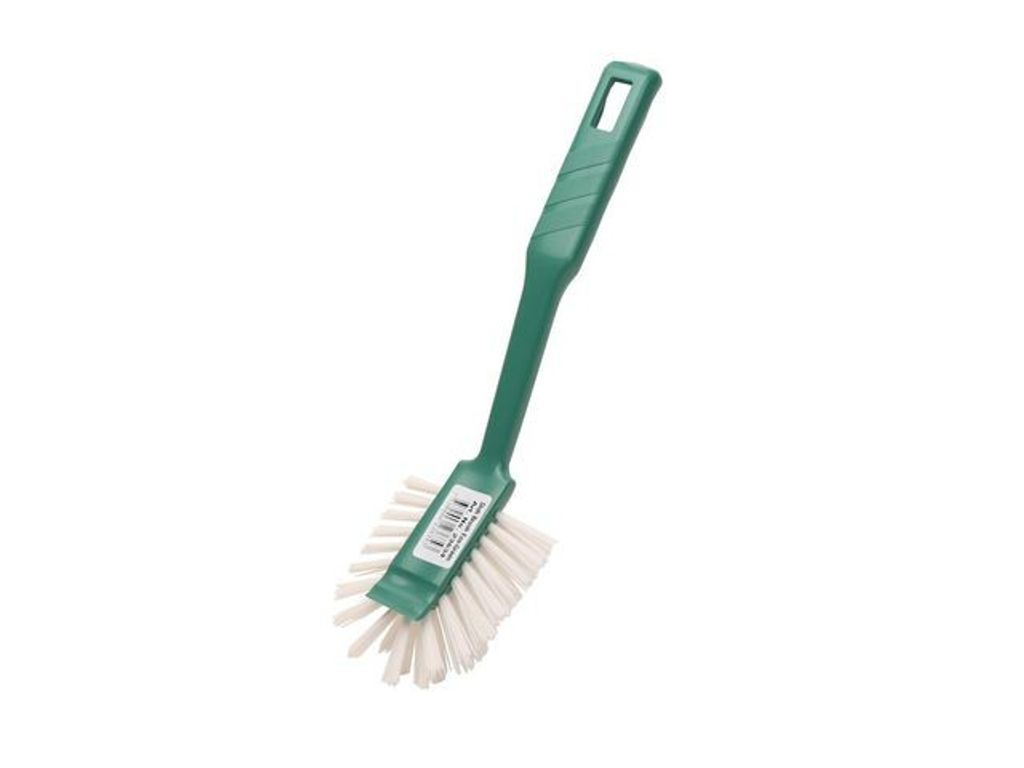 Beskrivning av Diskborste Eco Green grön Diskborste i 100% återvunnet material. Diskborsten har praktisk skrapkant samt handtagskrok. Tål disktemperatur över 100 grader. - Längd: 26 cm -
