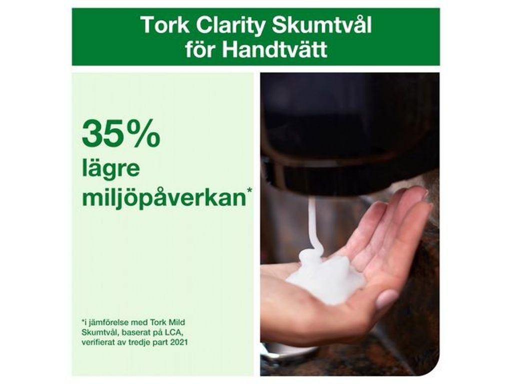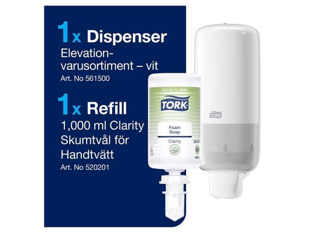 Komplett startpaket - innehåller en dispenser och en Clarity skumtvål. Kom igång med bra handhygienrutiner på ett smidigt sätt genom Tork Starter Pack med Tork Clarity Skumtvål. Paketet innehåller en vit S4 Skincare-dispenser och en refillflaska för Clarity Skumtvål. Spara in tid och arbete med Tork Skincare dispenser (S4) som tar mindre än tio sekunder att fylla på. De rengörande ingredienserna kommer från förnybara källor (vegetabiliskt ursprung) och har valts för att de har en lägre inverkan på vattenmiljön. Formulan är lätt biologiskt nedbrytbar. Fabriksförseglad refill med ny pump för varje påfyllning för att minska risken för smittspridning och skydda innehållet hela vägen till användaren. Flaskan kan återvinnas och krymper ihop efter hand som den används, vilket minskar avfallsvolymen. - Innehåller en dispenser och en refillflaska Clarity skumtvål - Clarity skumtvål miljömärkt med Eu Ecolabel - 99% naturliga ingredienser - Dermatologiskt testad - Certifierad enkel påfyllning av Svenska Reumatikerförbundet - Fabriksförseglad, ny pump till varje refill - Flaska som krymper ihop för minskat avfall - System: Tork S4 - pH-värde: 5 - Lukt: Oparfymerad - Utseende: Vitt transparent skum - EU Ecolabel: Licensnummer SE/030/002