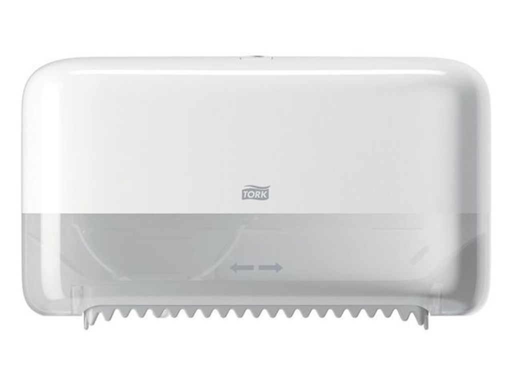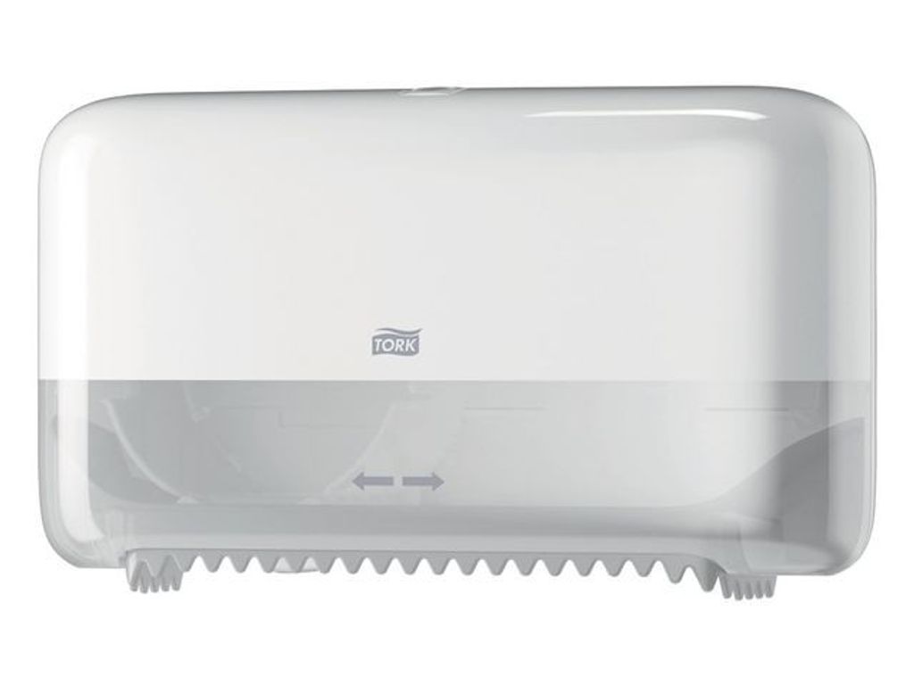 Tork Coreless Midsize Twin toalettpappersdispenser. Tork Dispenser Coreless Mid-size Twin Toalettpapper passar perfekt för toalettutrymmen med medelhög besöksfrekvens, där gästernas välbefinnande är extra viktigt. Den garanterar hög effektivitet och att toalettpapper alltid är tillgängligt för gästerna, eftersom den har plats för upp till nio gånger mer papper än två vanliga toalettpappersrullar. - System T7 - System Toalettpapper Mid-sizeTwin utan hylsa - Material: Plast - Höjd: 207 mm - Bredd: 360 mm - Djup: 130 mm - Färg: Vit