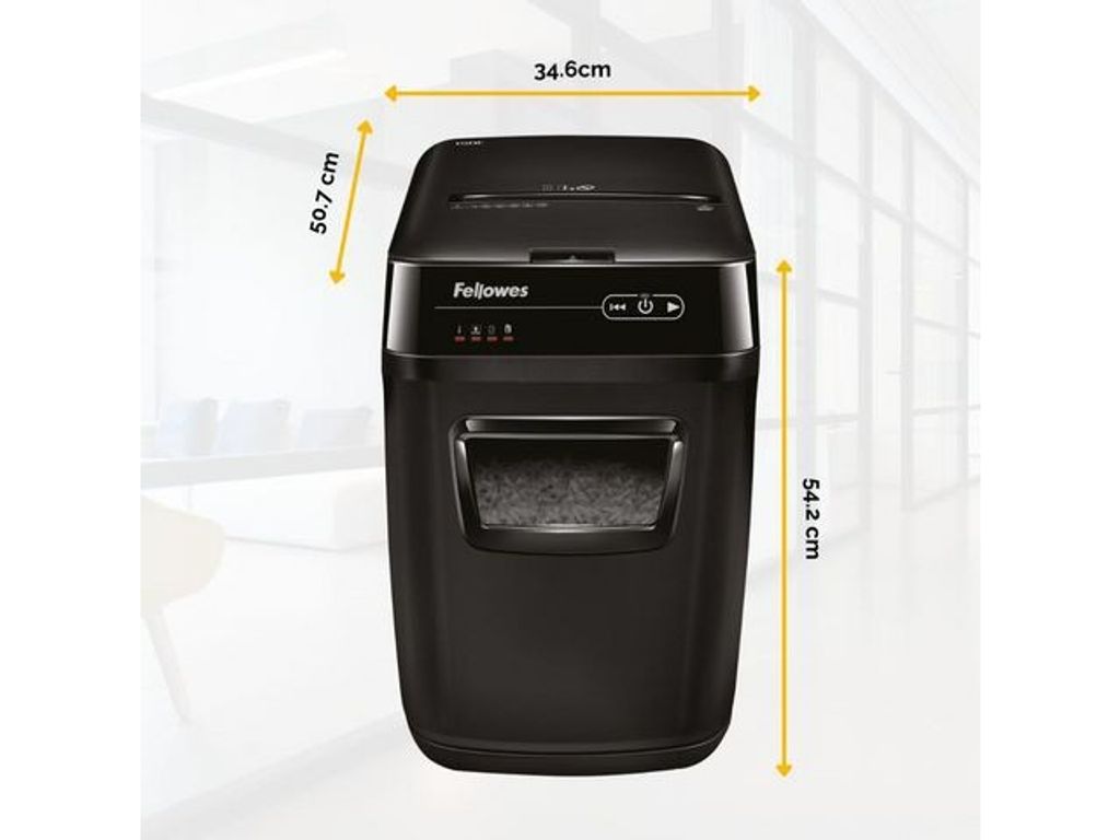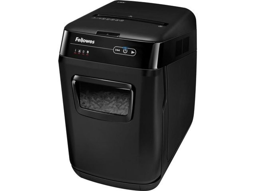 Fellowes AutoMax150C dokumentförstörare med korsstrimling är det perfekta tillskottet till alla mindre kontor Fellowes AutoMax 150C är en dokumentförstörare för kontor med upp till 3 användare och den kan strimla upp till 150 A4-ark automatiskt. Dokumentförstörarna gör alla konfidentiella dokument till mycket säkra (P-4) korsstrimlade partiklar på 4 x 38 mm så att post, kundinformation, kontoutdrag och mötesanteckningar är säkra från nyfikna ögon när de inte längre behövs. Dokumentförstöraren är försedd med Fellowes Auto Reverse System som förhindrar irriterande pappersstopp. Mycket tyst drift tack vare Fellowes SilentShred-teknik som minskar störande ljud på gemensamma kontor. Pappersuppsamlaren på 32 liter är perfekt för snabb och prydlig kassering av strimlade papper. 150C går automatiskt in i viloläge efter en tids inaktivitet, vilket sparar ström och pengar. - Kapacitet Automatisk matning: 150 ark - Kapacitet manuell matning: 8 ark - Skärtyp: Cross-cut, 4 x 38mm, P-4 - Papperskorgskapacitet: 32 liter - Förhindrar papperstrassel: Ja, Auto-Reverse - Skärhastighet: 3 m/minut - Klarar även: kreditkort, häftklamrar och gem - Driftstid: 12 minuter - Mått: 542 x 346 x 507 mm (H x B x D) - Vikt 14,4 kg - Garanti: 2 år - Färg: Svart