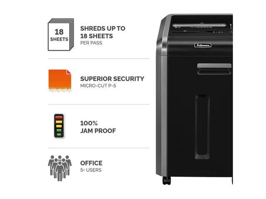 Effektiv mikrostrimlande dokumentförstörare med hög prestanda och flera smarta funktioner som 100% Jam Proof och Safe Sense. Passar utmärkt i kontoret med flera användare. Fellowes Powershred 225Mi skär upp till 18 ark åt gången i små bitar på 2x12mm, säkerhetsklass P-5. Papperskorgen på 60 liter rymmer cirka 600ark. 100% Jam Proof tekniken känner automatiskt av antal papper du matar in vilket helt förhindrar papperstrassel. Patenterade Safesense Teknologin stoppar automatiskt maskinen om fingrar kommer i kontakt med pappersöppningen. SilentShred teknik som minimerar bullerstörningar i delade arbetsutrymmen. Energy Saving System minimerar energiförbrukningen under drift samt sätter maskinen i viloläge när den inte används. Fellowes 225Mi kan strimla kontinuerligt utan att överhettas och förutom papper strimlar den även cd-skivor, kreditkort, gem och häftklamrar. - Skärtyp: Micro-cut, 2x12mm, P-5 - Skärkapacitet: 18 ark - Papperskorgskapacitet: 60 liter, ca 2000 ark - Klarar även: Gem, häftklammer, kreditkort och CD - Förhindrar papperstrassel: Ja, 100% Jam Proof - Säkerhetsfunktion: Ja, Safe Sense - Skärhastighet: 5 m/minut - Hjul: Ja, varav 2 är låsbara - Mått: 785 x 454 x 435 mm (H x B x D) - Vikt: 37,7 kg - Garanti: 2 år - Färg: Svart