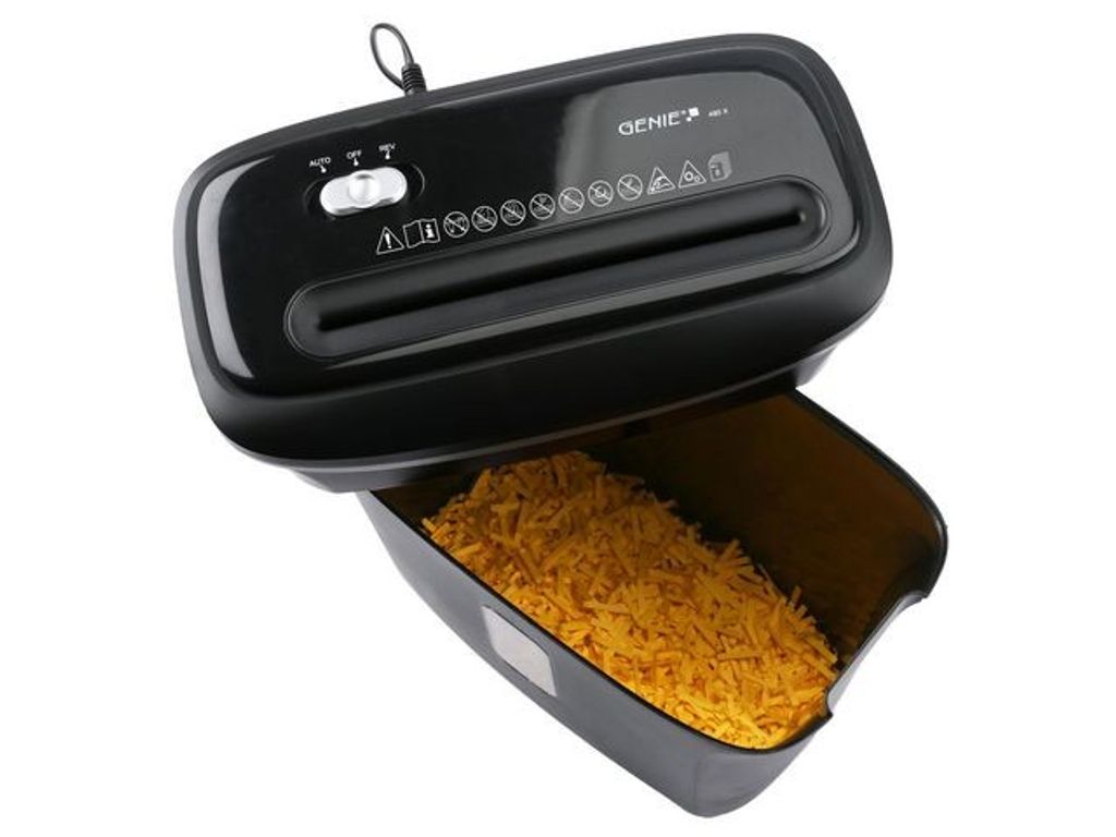 Den här dokumentförstöraren för 8 ark från Genie är idealisk för vardagsbruk i hemmet eller på kontoret. Den hanterar alla mindre och medelintensiva uppgifter. - Uppsamlingskapacitet: 12 liter - Skärstorlek: 4 x 35 mm - Ljudnivå: 72 dB - Driftstid: 2 min - Säkerhetsklass: P-4 as DIN 66399-2 - Antal ark: 8 (80 g/m²) - Mått: 32,2 x 32,5 x 17 cm - Vikt: 3,26 kg