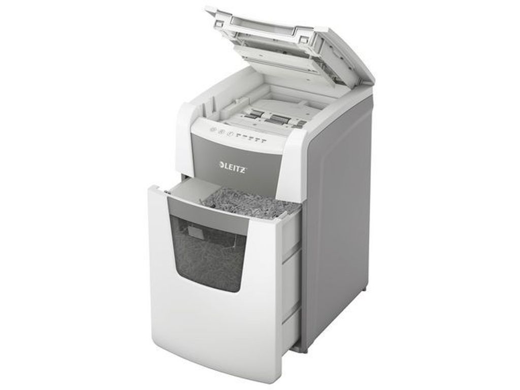 Helautomatisk dokumentförstörare från Leitz med unik tömningsfunktion. Så intelligent att den fungerar tyst på egen hand, sätt bara in din pappersbunt (inkl. häftklamrar och gem), stäng locket och fortsätt med annat. Perfekt för användning på kontor. Hög säkerhet och utmärkt prestanda med denna trasselfria, tysta automatiska dokumentförstörare med lång driftstid (30 min). Makulera automatiskt 150 ark A4 i säkerhetsklass P5 (2x15 mm) mikroskärning i ett tag i den generösa 44L avfallsbehållaren. Enkel manövrering med touch-kontroller. Vi rekommenderar att man använder oljeark var tredje gång man tömmer dokumentförstörarens avfallsbehållare. - Automatisk matning för upp till 150 ark A4, springa för manuell inmatning av upp till 6 ark (80 g/m2) - Unik ren tömningsfunktion (skärverket reverserar efter varje användning) för att förhindra att pappersstrimlor faller ned bakom avfallsbehållaren när den dras ut - Infraröd sensor som varnar vid 80% full avfallsbehållare för att upplysa användaren att tömma behållaren för att undvika röra - Mycket tyst drift - för en lugn arbetsmiljö (när du använder Leitz oljeark regelbundet) - Anti-jam-teknik för oavbruten makulering - stoppar automatiskt och backar ut papperet när för mycket papper sätts in - Kontinuerlig körningstid på 30 minuter så att hela kammaren kan strimlas på en gång, ECO-läge aktiveras efter 3 minuters inaktivitet - Skärtyp: Mikroskärning (2x15 mm) - Säkerhetsnivå: P5 - Generös 44L utdragbar avfallsbehållare så att hela kammaren kan strimlas - Touch-kontroller - enkelt och intuitivt för enkel drift - Makulerar även kreditkort, häftklamrar och gem - 2 + 1 års garanti (även på skärverket) - registrera för att få ditt extra år