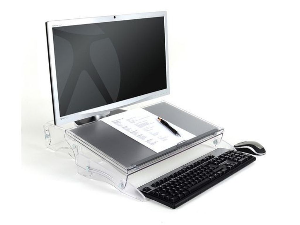 Dokumenthållaren BakkerElkhuizen FlexDesk 640 går att justera i höjdled för att skapa en ergonomisk arbetsplats. FlexDesk 640 från BakkerElkhuizen är en högkvalitativ dokumenthållare och sluttande skrivbänk som kan placeras mellan skärmen och tangentbordet för att göra det enklare att arbeta med dokument och datorn samtidigt. Den här produkten kan justeras i höjdled för att hitta en optimal visningsvinkel för varje användare. Det motverkar ömma nackmuskler och förbättrar kroppshållningen. Den smarta designen gör att du kan ha ett tangentbord i fullständig storlek under det. - Skapar en mer hälsosam arbetsmiljö - Material: Genomskinlig akryl med satinliknande yta - Vikt: 2,2 kg - Olika höjdinställningar: 115 – 175 mm - Mått: 110 x 515 x 380 mm