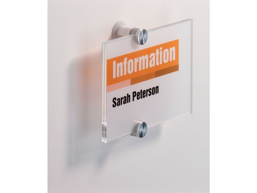 Durable Crystal Sign dörrskylt är tillverkad av högkvalitativt akrylglas, vilket gör den tålig och robust samt ger den ett elegant utseende. Den här tåliga dörrskylten visar personuppgifter och är ett elegant inslag på kontoret. Den har en film placerad mellan två akrylplattor som i sin tur sitter fast i väggen med två stadiga skruvar. De blanka kanterna och den halvgenomskinliga bakgrunden ger dörrskylten dess överlägsna utseende. Dessutom levereras dörrskylten med två filmer som är utbytbara och kompatibla med laserskrivare. - Med polerade kanter och en halvgenomskinlig bakgrund - Levereras med två filmer som är kompatibla med laserskrivare - Två skruvar medföljer - Material: Akrylglas - Färg: Transparent - Mått: 148 x 105 mm