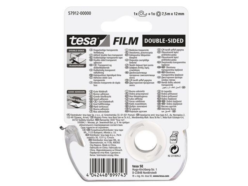 Genomskinlig och dubbelsidig tejp från tesa med klister på båda sidor. Levereras i en praktisk handhållare för snabb och enkel användning. Med klister på båda sidor för ihopfästning av papper eller kartong. Baksidan av polypropylen gör den enkel att riva loss från rullen och klistret ger ett fast grepp. Använd denna tejp till presentationer, professionella rapporter eller när du skapar scrapbooksamlingar. Tejpen åldras långsamt och ger ett professionellt resultat för rapporter eller scrapbooksamlingar. - Mått: 12mm x 7,5m - Färg: transparent