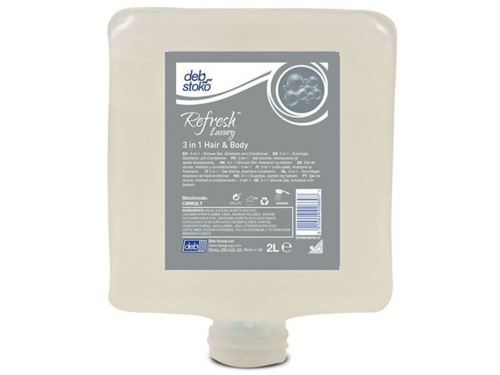 Beskrivning av Duschtvål Refresh Lux 3in1 HairoBody 2L Lyxig 3-i-1-duschtvål, schampo och balsam. Härligt parfymerad, lämplig i duschrum för både honom och henne.