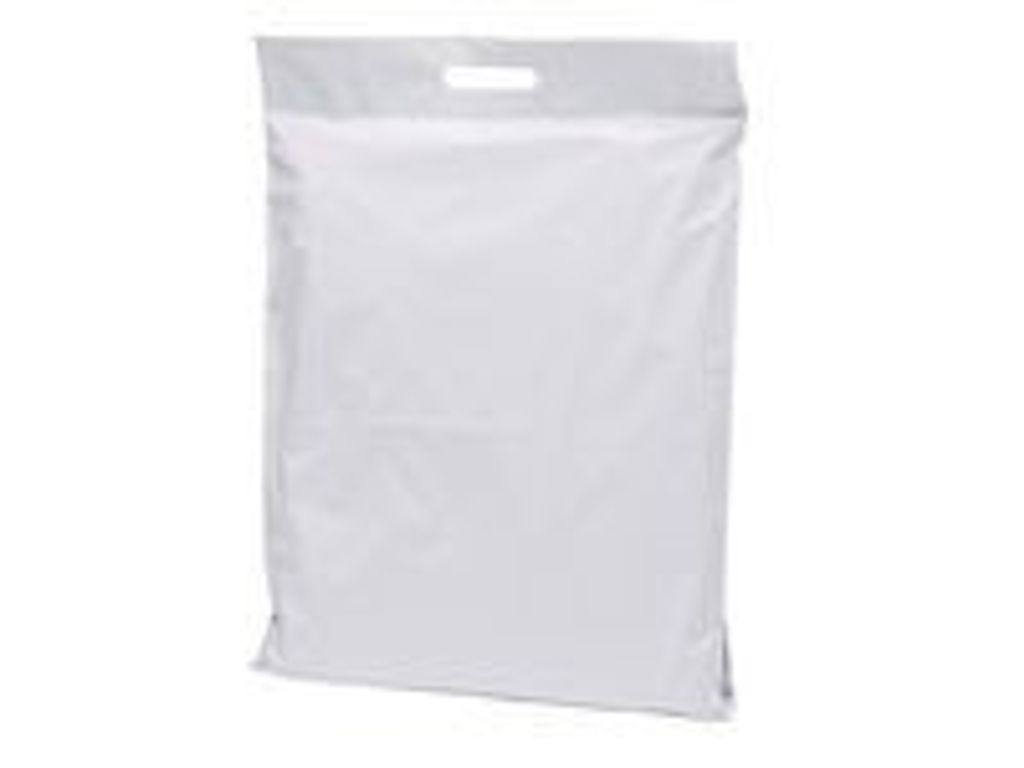 Slitstark E-handelspåse tillverkade i 100% återvunnen LDPE plast. Påsarna är COEX-truderade vilket betyder att dom är tillverkade i flera olika skikt, svart insida / vit utsida så man inte ska kunna se igenom påsen. Påsarna har ett urstansat handtag som gör det enkelt att bära påsen. De har även en limsträng med permanent lim för enkel och säker förslutning av påsen. - Med urstansat handtag - Material: 100% återvunnen LDPE plast - Mått: 720x595+70+50mm - Färg: Vit