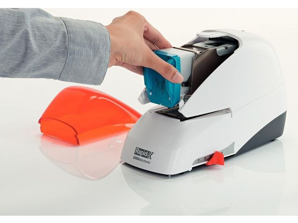 5050e för enkel häftning. Patenterad kassetthäftningsteknik häftar 5000 gånger utan omladdning och oavsett antal ark. Designad för 500 000 häftningar. En helautomatiskt häftapparat med ett justerbart häftdjup på upp till 50mm. Den är lätt att ladda med ny kassett och vid byte av klammerkassett byts alla slitdelar ut. Patenterad kassetthäftningsteknik. Maskinen indikerar i god tid innan klammerkassetten tar slut med hjälp av en påfyllningsindikator. Denna elhäftare är eldriven med adapter till vägguttag. - Justerbart häftdjup på upp till 50mm - Levereras med 1 klammerkassett (5 000 klammer) - Vikt: 2,2kg. - Kapacitet: Upp till 50st pappersark (80 g/m²) - Passande klammerkassett: 5050E med 5000/fp - 2 års garanti - Enkel laddning av klammer - Adapter medföljer för elanslutning - Gapdjup: 50mm - Häftar upp till 50 ark papper (80 g/m2)
