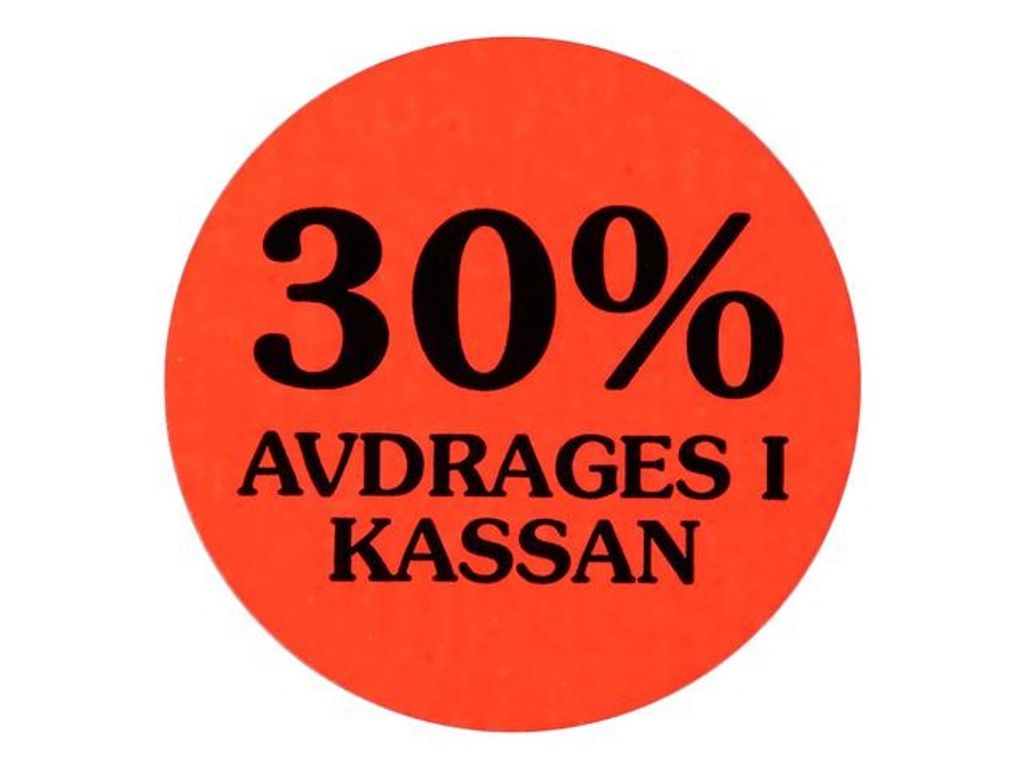 Beskrivning av Etikett 30% avdrages i kassan 2000/RL För effektiv märkning i butiken. Etikettens storlek är 29mm. Fast klistertyp. 2000st/rl.