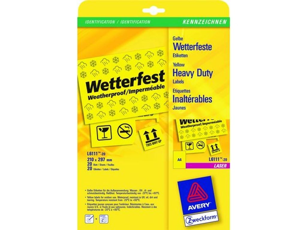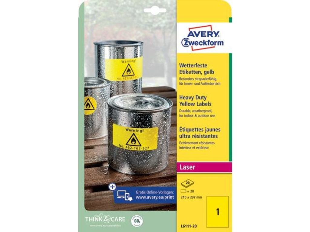 Etiketter som hjälper dig att se viktiga meddelanden eller varningar på ett tydligt och enkelt sätt. Averys starka, gula etiketter är perfekta för permanent, synlig och iögonfallande varningsskyltning och märkning, både inomhus och utomhus. Tillverkade av ett slitstarkt och hållbart polyestermaterial som inte kan rivas sönder och fäster permanent och säkert. Etikettpappret är klargult och papperskvaliteten ger vackra och skarpa utskrifter. De klarar olja, smuts, vatten, fukt, UV-strålning och temperaturer från -20 °C till +80 °C, vilket gör dem perfekta för utomhusbruk i alla väder och inomhusbruk i miljöer som kräver hög hållbarhet. För t.ex. elektriker, installatörer, tillverkningsföretag, måleriföretag, laboratorier, sjukhus, lagerbyggnader, osv. där arbetssäkerheten är viktig och det finns många varningar i samband med användning av tillverkningsutrustning, elskåp, mätskåp med mera. Avery L6111-20 gula, starka etiketter med 1 etikett/ark och 20 etiketter/pkt och etikettmått 210 x 297 mm. Etiketternas storlek är avsedd för skyltning och stora föremål. Etiketterna kan skrivas ut med alla svart/vita laserskrivare. Averys JamFREE™-garanti säkerställer dessutom att du inte behöver bekymra dig för om etiketterna fastnar i skrivaren och orsakar stopp. Du kan enkelt och lätt designa och skriva ut med gratisprogrammet Avery Design & Print på www.avery.eu. Följ stegen på skärmen så får du hjälp genom hela design- och utskriftsförloppet. Programmet innehåller även många olika fördesignade element som enkelt kan anpassas efter det egna behovet. - Mått: 210 x 297 mm - Färg: Gul