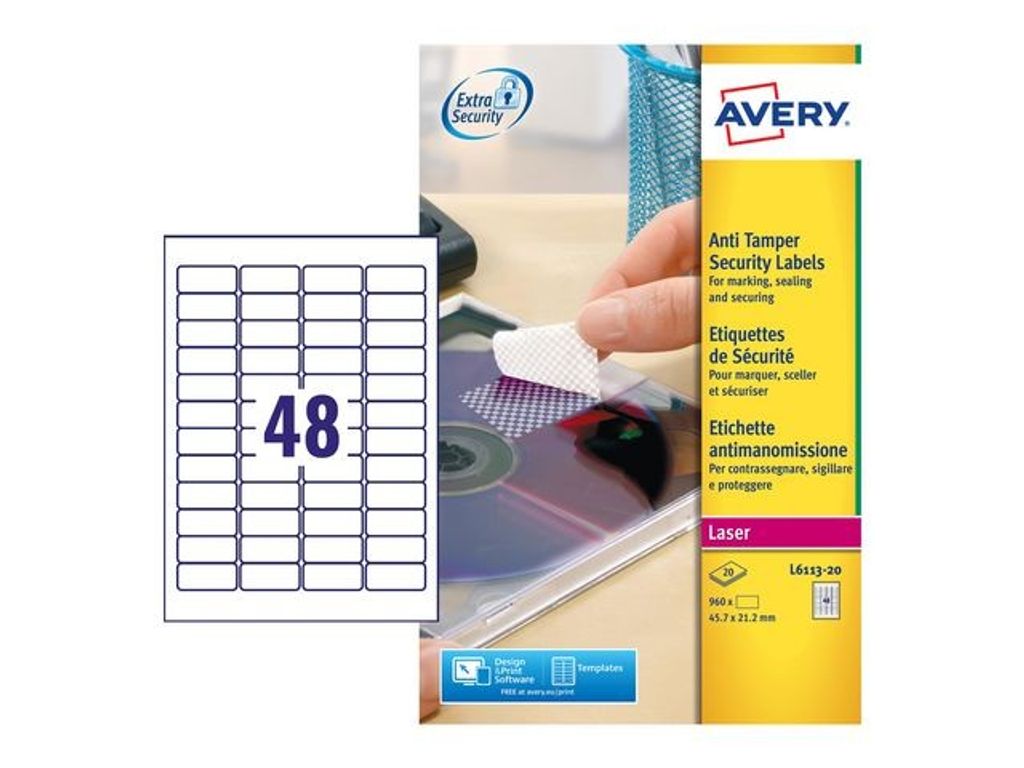 Averys plomberingsetiketter som efterlämnar ett mönster är det perfekta valet om du enkelt och effektivt vill stöldmärka dina handverktyg, mobila enheter eller andra värdeföremål med namn, företag och övriga kontaktuppgifter så att de lätt kan identifieras och spåras om föremålen skulle råka stjälas eller komma bort. Etiketterna är tillverkade i ett polyestermaterial som efterlämnar ett mönster om de tas bort. Alla försök till manipulation kommer att synas tydligt. Detta gör det direkt uppenbart för polisen vid en eventuell vidareförsäljning eller för dig själv om någon försöker ta av etiketterna eller bryta förseglingen. Förutom plomberingsegenskapen är de dessutom motståndskraftiga mot olja, smuts och UV-strålning samt tål temperaturer från –40°C till +80°C. De fäster på metall, glas, papper, plast mm. Detta gör dem även extra lämpliga för utomhusbruk, t.ex. på verktyg. Etikettstorleken är lämplig för märkning av t.ex. handverktyg, mobila enheter som bärbara datorer, surfplattor och värdesaker i hemmet som smyckesaskar, målningar, mindre inredningsdetaljer m.m. De är också idealiska för att plombera viktiga brev, dokument och skrivelser där det är viktigt att se om mottagaren har läst dokumentet i fråga. Etiketterna kan skrivas ut på alla svartvita laserskrivare. Observera att det tar ett dygn innan den slutliga vidhäftningsförmågan uppnås. Du kan enkelt - och helt gratis - designa och skriva ut dina Avery-produkter med deras mjukvara Avery Design & Print, som innehåller mallar, grafik och designmöjligheter. Läs mer om mjukvaran här: www.avery.se/programvara - Mått (b x h): 45,7 x 21,2 mm - Skrivare: S/V laserskrivare - Limtyp: Permanent - Färg: Vit - Material: Polyester - Produktegenskaper: Väderbeständiga, Temperaturresistent, Vattenskyddad, Efterlämnar ett mönster - Form: Rektangulär med runda hörn - Format: A4