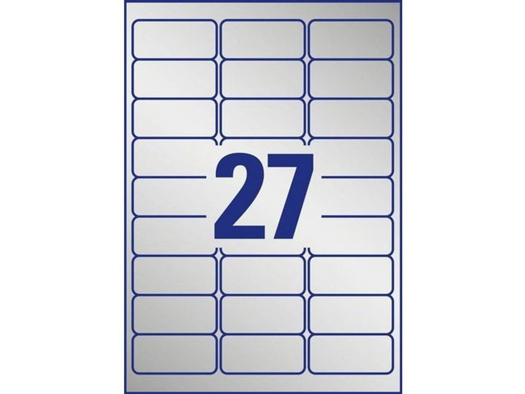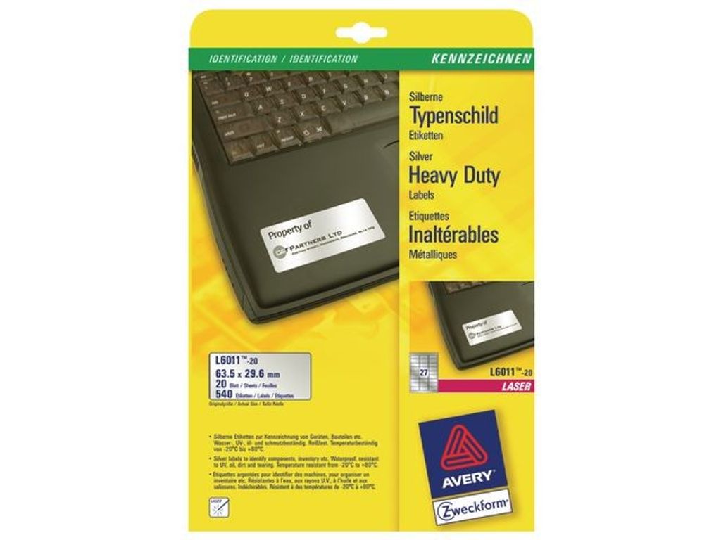 De här extrastarka, permanenta Avery-etiketterna är vädertåliga så att de kan användas för inomhus- och utomhusbruk, och är perfekta för att märka elektroniska enheter. Dessa tåliga, slitstarka etiketter från Avery är vädertåliga och mycket tuffare än vanliga pappersetiketter. De har extra stark vidhäftning och tål vatten, olja, smuts, UV-strålar och extrema temperaturer (–40 °C till +150 °C). De är perfekta för att märka små elektroniska komponenter eller större maskiner med företagets logotyp eller ID-kod. Lämpar sig för utskrift i de flesta svartvita laserskrivare och du kan skapa din egen personliga touch med hjälp av mallarna i programvaran Avery Design & Print. Dessa polyesteretiketter har en filmbeläggning och producerar en tydlig och skarp finish på dina utskrifter. - Slitstarka, permanenta etiketter för inomhus- och utomhusbruk - Använd för att märka IT- eller elektronisk utrustning - Olje-, smuts- och vattenbeständig - Tål temperaturer från –40 °C till +150 °C - Slitstarka - Passar för svartvita laserskrivare och kopiatorer - Skapa dina personliga etiketter med hjälp av den kostnadsfria programvaran Avery & Print Design - Enkel att använda - Format: A4 - Totalt antal etiketter: 540 - Mått: 63,5 x 29,6 mm - Färg: Silver