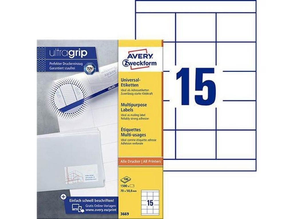 Kvalitativa etiketter! Har du flera olika typer av skrivare på kontoret? Inga problem, du behöver bara köpa en typ av etiketter – med Averys vita 3669 permanenthäftande universaletiketter för inomhusbruk med 15 etiketter/ark och 1 500 etiketter/förpackning får du etiketter som kan användas i sv/v- och färglaserskrivare, bläckstråleskrivare och kopieringsmaskiner. Du behöver alltså inte vara orolig för om du har lagt etiketter för bläckstråleskrivaren i laserskrivaren. Etiketterna är lämpliga för en rad olika användningsområden där du behöver använda permanent märkning, t.ex. adressetiketter på små brev, märkning av föremål eller organisering av mappar. De fäster säkert, tillförlitligt och permanent på alla slags släta ytor. Papperskvaliteten är optimerad så att du får snygga och knivskarpa utskrifter oavsett vilken typ av skrivare du använder. Etiketter med förstärkt grepp, ultragrip. Ett unikt 3D-mönster på arken gör att skrivaren kan få perfekt grepp om dem. Tack vare dessa greppzoner kan skrivarvalsarna greppa och mata fram och styra etikettarken ännu bättre. Precisa utskrifter utan pappersstopp garanteras! Etiketterna har en pålitlig och permanent vidhäftning. Med Averys etiketter med QuickPEEL™ sparar du inte bara tid, de hjälper dig också att bevara miljön då de är FSC®-certifierade och därmed bara producerade av papper från hållbart skogsbruk samt kan återvinnas tillsammans med allmänt pappersavfall. På www.avery.eu hittar du massor av mallar som du kan använda för att enkelt och GRATIS designa och skriva ut dina Avery-etiketter. - Mått: 70x50,8mm