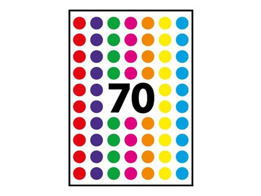 Runda etiketter med permanent vidhäftning. Lämpliga för t.ex. organisering eller användning i skolan Självhäftande, runda etiketter i ljusa färger. Med 8 mm i diameter. Färgkoda din kalender och prioritera uppgifter eller idéer. Etiketterna fäster perfekt på de flesta ytor. Utvalda färger. - Material: Papper - Typ av lim: Permanent - Form: Rund - Diameter: 8 mm - Antal etiketter/ark: 70 - Antal ark/fp: 6