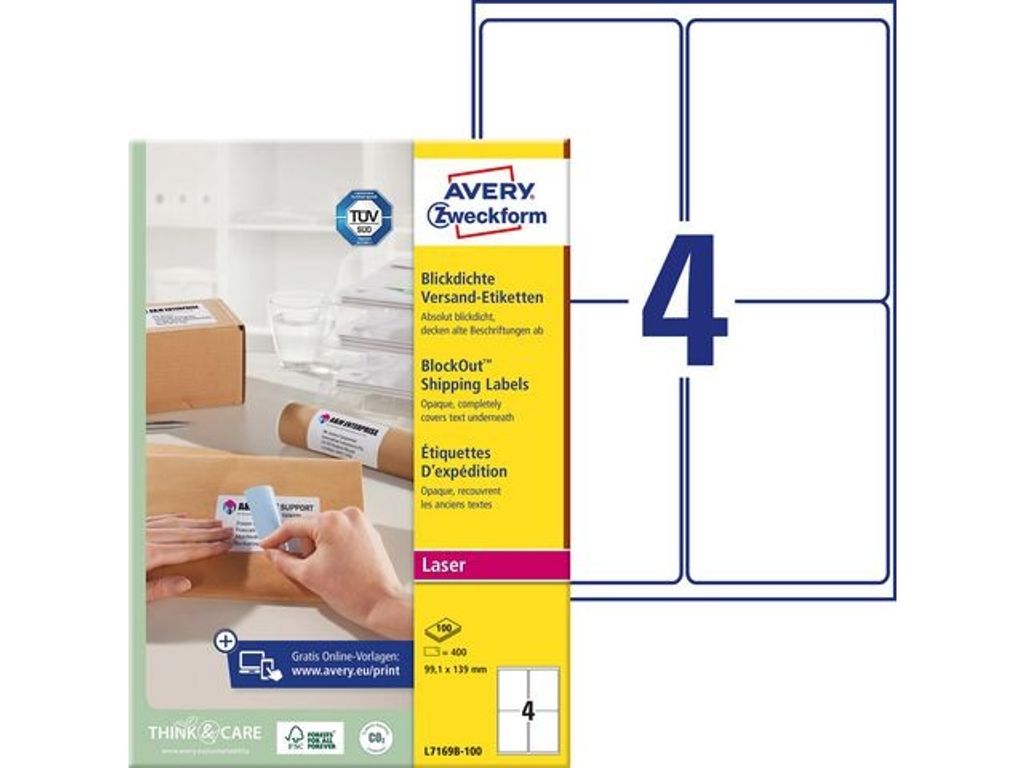 Lämpliga som returetiketter när du behöver returnera ett köp du gjort i en nätbutik eller skicka ett paket Ge dina paket och brev ett professionellt utseende genom med dessa helvita, 100 % täckande paketetiketter. Avery L7169B-100 med BlockOut™ har 4 etiketter/ark och 400 etiketter/förpackning. De är tillverkade i ett material som dels döljer gammal text och gamla etiketter och dels håller hela transporten. De är det idealiska och ekonomiska valet eftersom de täcker gammal text och gamla etiketter till 100 % så att du enkelt kan återanvända tidigare använt emballage och skicka dina paket med tydlig mottagarinformation. Det gör etiketterna särskilt lämpliga som returetiketter när du behöver returnera ett köp du gjort i en nätbutik eller skicka ett paket. Etikettstorleken är idealisk för paket, rör och kartonger. De är kompatibla med alla vanliga sv/v- och färglaserskrivare. Den höga papperskvaliteten ger vackra och skarpa utskrifter. Averys JamFREE™-garanti säkerställer dessutom att du inte behöver bekymra dig för om etiketterna fastnar i skrivaren och orsakar stopp. Etiketterna har en pålitlig och permanent vidhäftning. Med Averys etiketter med BlockOut™ sparar du inte bara pengar genom att återanvända emballage, de hjälper dig också att bevara miljön då de är FSC®-certifierade och därmed bara producerade av papper från hållbart skogsbruk samt kan återvinnas tillsammans med allmänt pappersavfall. Du kan enkelt - och helt gratis - designa och skriva ut dina Avery-produkter med vår mjukvara Avery Design & Print, som innehåller mallar, grafik och designmöjligheter. Läs mer om mjukvaran här: www.avery.se/programvara - Antal: 400/fp