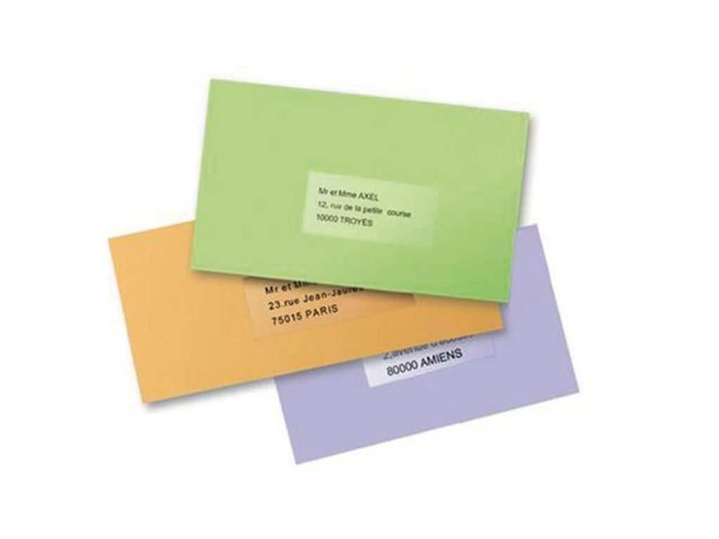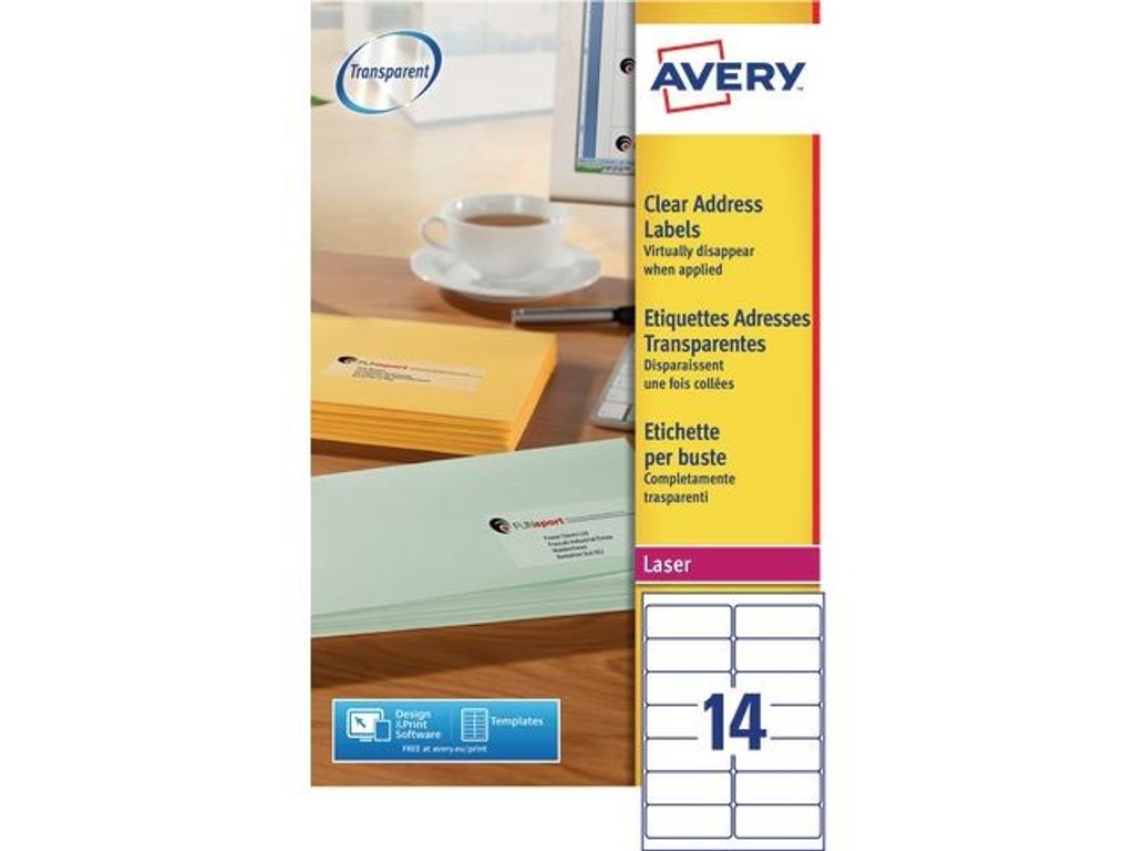 Genomskinliga adressetiketter som ger ett professionellt utseende på dina kuvert eller mindre paket. Tillverkade av polyester och innehåller QuickPEEL-teknik, vilket ger dig möjlighet att fästa etiketter snabbt. Dela bara upp etiketterna på arket längs perforeringen för att exponera etikettens kanter för att sedan dra och fästa. Det gör märkningen av din post så mycket snabbare. De skrivs ut med en knivskarp bild och klara färger och du kan även skapa din egen personliga prägel på etiketterna med hjälp av programvarumallar från Avery Design Print. Du hittar dem på avery.se/programvara. - Mått: 99,1 x 38,1 mm - Totalt antal etiketter: 350 - Färg: transparent - Form: rundade hörn