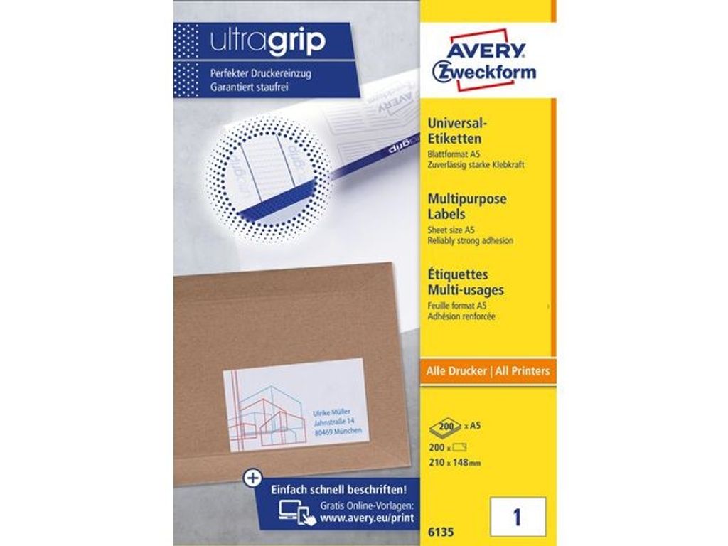 Universaletiketter med Ultragrip på A5-ark De vita permanenthäftande universaletiketterna med Ultragrip på A5-ark 6135, 210 x 148 mm, från Avery är lämpliga för försändelser och märkning. 1 etikett/A5-ark och 200 etiketter/förpackning (förpackningen är i A4-format). Etiketter på A5-ark är perfekta när du ska skriva ut små upplagor. De har förbättrad kvalitet med minst 55 % starkare vidhäftning på alla vanliga ytor (testat enligt FTM2/24h, produktstandard: 02/2014). Papperskvaliteten är optimerad så att du får snygga och knivskarpa utskrifter oavsett vilken typ av skrivare du använder. Etikettarken är försedda med vår unika Ultragrip-teknik som har ett unikt tredimensionellt mönster som gör att skrivarna får ett perfekt grepp i arket. Greppområdet säkerställer att skrivarens valsar kan greppa, föra in och styra etikettarket på ett bättre sätt. Det gör att du inte behöver bekymra dig för att etiketterna skrivs ut snett eller fastnar i skrivaren och orsakar stopp. Etiketterna fäster bra och är FSC®-certifierade och därmed bara producerade av papper från hållbart skogsbruk samt kan återvinnas tillsammans med allmänt pappersavfall. - Mått: 210x148mm - Etiketter på A5-ark är optimala för små upplagor - Kan användas i alla vanliga skrivare och kopiatorer