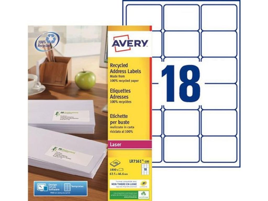 Etiketter som ger fina och knivskarpa utskrifter oavsett skrivare. Avery QuickPEEL-etiketter av 100 % återvunnet papper med 18 etiketter per ark och 1800 etiketter per förpackning. Tillverkade av 100 % återvunnet papper, har ett vattenbaserat och mer miljövänligt lim samt är förpackade i återvunnen kartong. Produktionen av dessa etiketter är utformad för att undvika onödig avskogning samt förbruka mindre energi och vatten. Averys JamFREE™-garanti säkerställer att du inte behöver bekymra dig för om etiketterna fastnar i skrivaren och orsakar stopp. Med en pålitlig och permanent vidhäftning. På www.avery.se/programvara hittar du massor av mallar som du kan använda för att enkelt och GRATIS designa och skriva ut dina Avery-etiketter. - Mått: 635 x 466mm - Antal: 1800/fp
