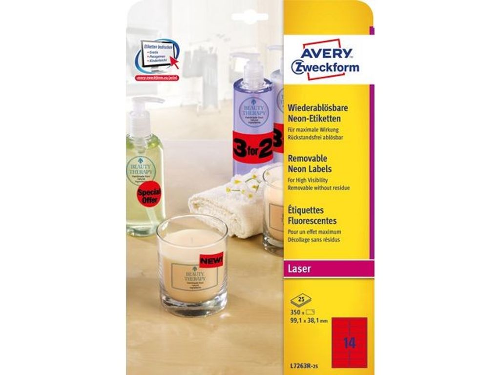 Avtagbara vita universaletiketter för inomhusbruk. Averys avtagbara etiketter är perfekta för tillfällig skyltning eftersom de lätt kan tas bort utan att lämna några limrester. De fäster bra på en rad olika släta ytor, så oavsett om du behöver dem för att märka elektronisk utrustning eller för tillfälliga anvisningar kan du vara säker på att de sitter kvar och kan tas bort när de inte längre behövs. Averys JamFREE™-garanti säkerställer att du inte behöver bekymra dig för att etiketterna ska fastna i skrivaren och orsakar stopp. Du kan enkelt och helt gratis designa och skriva ut dina Avery-produkter med vår mjukvara Avery Design & Print, som innehåller mallar, grafik och designmöjligheter. Läs mer om mjukvaran på www.avery.se/programvara. - Mått: 99,1x38,1mm - Antal: 14 etiketter/ark och 350 etiketter/förpackning