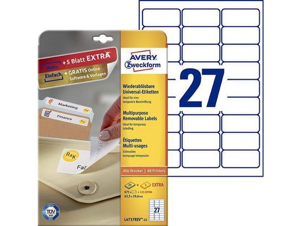 Avtagbara vita universaletiketter för inomhusbruk. Averys avtagbara etiketter är perfekta för tillfällig skyltning eftersom de lätt kan tas bort utan att lämna några limrester. De fäster bra på en rad olika släta ytor, så oavsett om du behöver dem för att märka elektronisk utrustning eller för tillfälliga anvisningar kan du vara säker på att de sitter kvar och kan tas bort när de inte längre behövs. Averys JamFREE™-garanti säkerställer att du inte behöver bekymra dig för att etiketterna ska fastna i skrivaren och orsakar stopp. Du kan enkelt och helt gratis designa och skriva ut dina Avery-produkter med vår mjukvara Avery Design & Print, som innehåller mallar, grafik och designmöjligheter. Läs mer om mjukvaran på www.avery.se/programvara. - Totalt antal etiketter: 675 - Mått: 63,5 x 29,6mm - Färg: vit