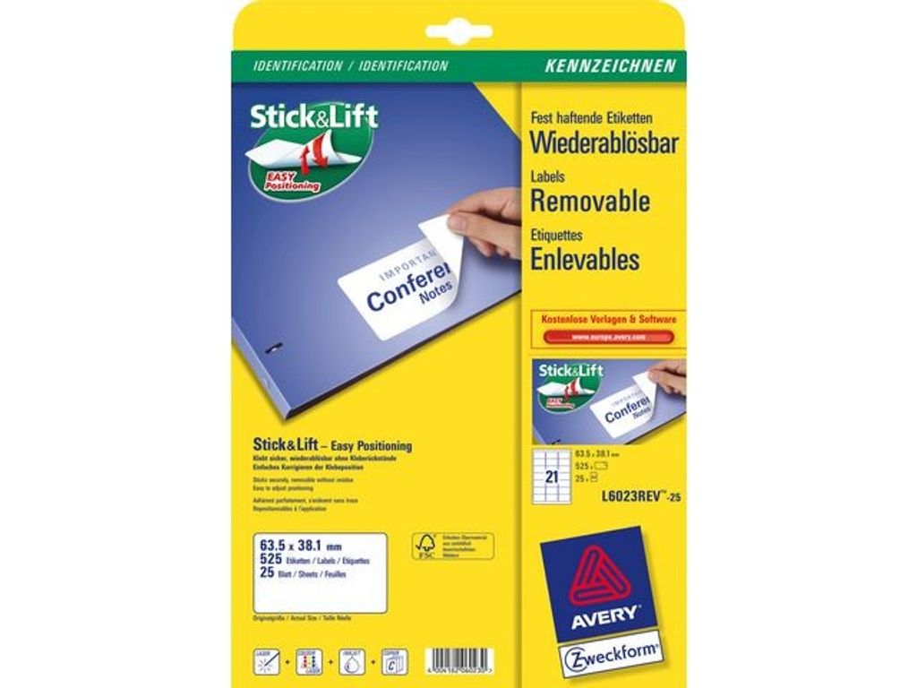 Avtagbara vita universaletiketter för inomhusbruk. Averys avtagbara etiketter är perfekta för tillfällig skyltning eftersom de lätt kan tas bort utan att lämna några limrester. De fäster bra på en rad olika släta ytor, så oavsett om du behöver dem för att märka elektronisk utrustning eller för tillfälliga anvisningar kan du vara säker på att de sitter kvar och kan tas bort när de inte längre behövs. Averys JamFREE™-garanti säkerställer att du inte behöver bekymra dig för att etiketterna ska fastna i skrivaren och orsakar stopp. Du kan enkelt och helt gratis designa och skriva ut dina Avery-produkter med vår mjukvara Avery Design & Print, som innehåller mallar, grafik och designmöjligheter. Läs mer om mjukvaran på www.avery.se/programvara. - 63,5 x 38,1mm